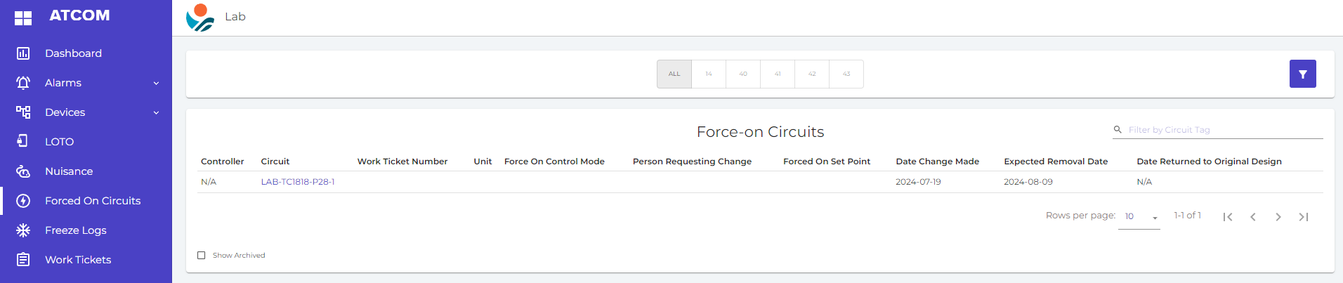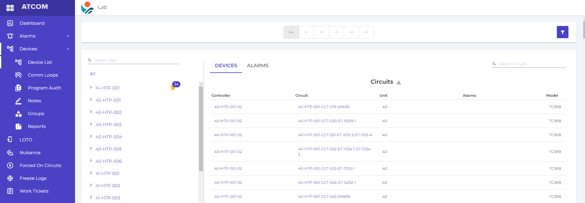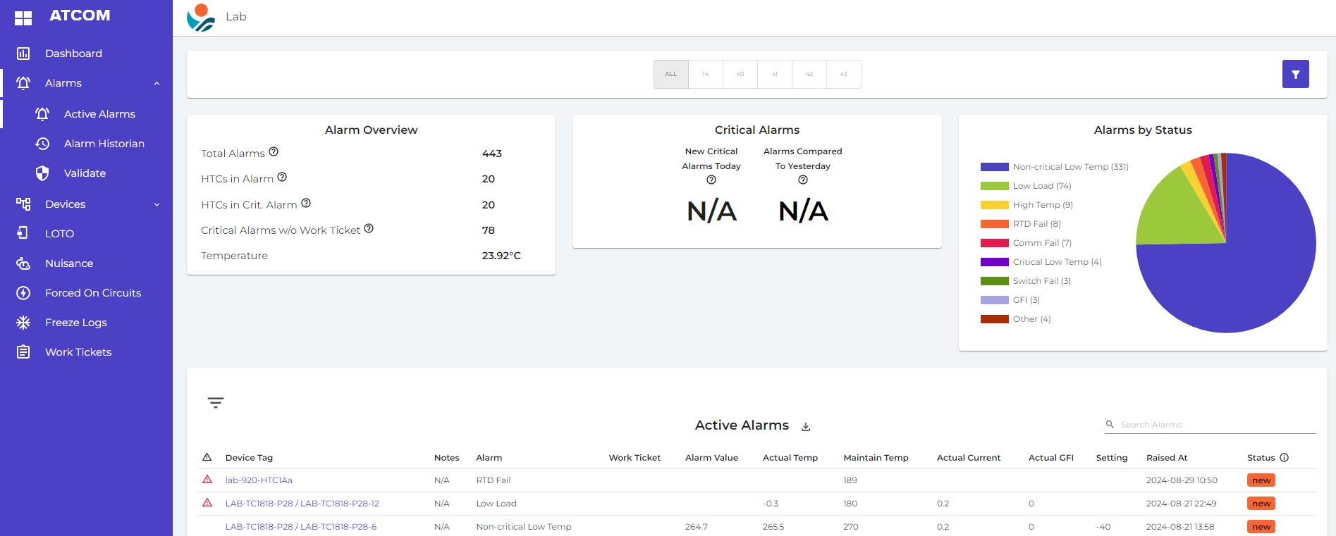 In most ATCOM+ pages, you'll notice a filter bar located at the top of the screen. This convenient tool allows you to quickly filter data based on specific facility areas or heat trace circuits, making it easier to focus on the information you need.