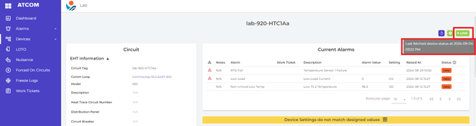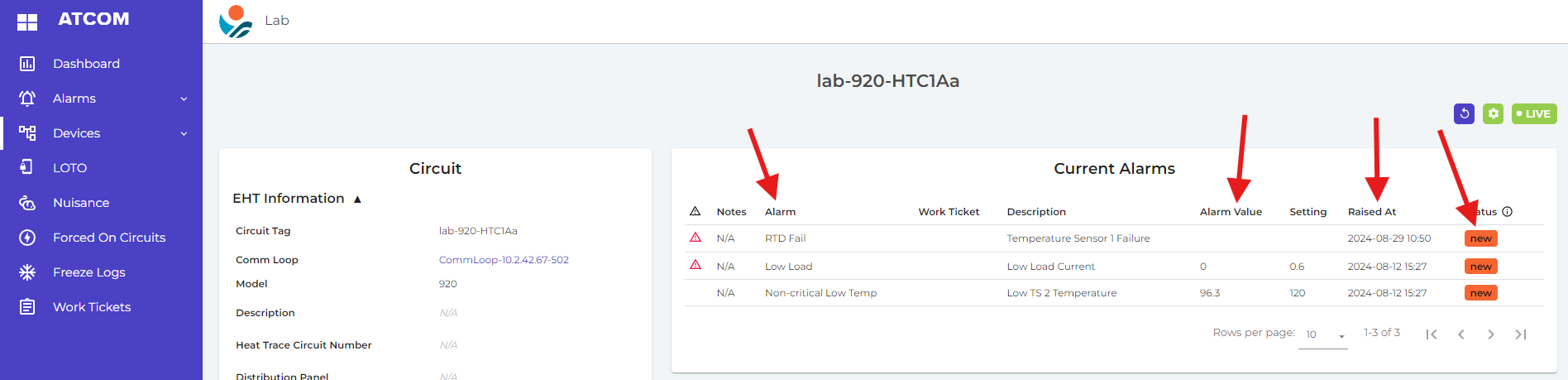 - In ATCOM+, the "Alarms" section is where you can conveniently monitor all alarms generated by the heat trace controller associated with the selected circuit. This section provides essential information regarding the alarms, including their specific alarm values and the live values associated with them. It's worth noting that these values may differ, especially in scenarios like low-temperature alarms where the alarm value typically reflects when the alarm was triggered and may not represent the current temperature status.