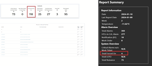 ATCOM+ will also automatically display the number of Forced-On circuits in the outlook section of the dashboard display, as well as in the EHT Alarm report summary in the system overview section. Users will be notified in the EHT Alarm report summary email or when building the EHT Alarm report summary when Forced-On circuits are still on past the expiry date, and this is intended to prompt users to investigate if the force on is still valid.