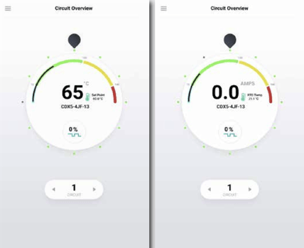 The center of the dial showcases the highlighted circuit's live temperature, target temperature, circuit name, and on-off duty cycle. Tap anywhere inside the dial to access the dashboard for that circuit.