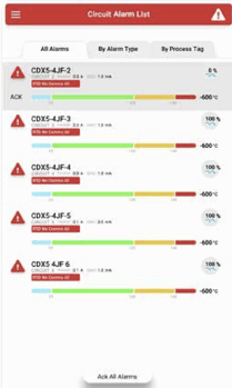 Access the Circuit Alarm List from the Menu. Here, live panes for each circuit in alarm are organized in a list with tabs for all alarms, categorized by alarm type, or by process. To acknowledge an alarm, simply tap "ACK" on the left of the circuit pane. A box will display each alarm for that circuit, allowing you to acknowledge individual alarms or all alarms for that circuit.