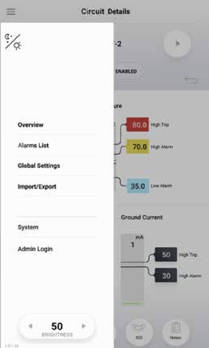 To access the Main Menu, simply tap the 'hamburger' icon located in the upper left corner of any screen. Use the Menu to effortlessly navigate between Overview, Circuit List, Global Settings, and the System screen. Additionally, you can switch between night and day color profiles and perform tasks like importing and exporting configurations, isometrics, and more.