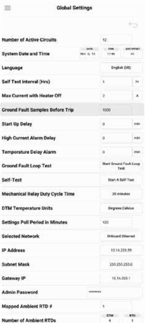 | High Trip Settings | Enable or disable buttons for Temperature, Current and Ground Current trips | Enable/Disable • When a trip is enabled the alarm must be acknowledged to reset the circuit | |||