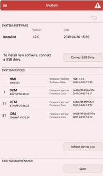 The System section offers tools for updating system software and firmware, displaying the current installed version. By selecting the "Mount USB Drive" button, users can access a list of all Genesis Controller modules, along with their respective addresses and firmware versions. Access to this section requires Admin Login for security purposes.