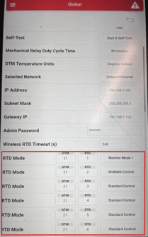 | Mapped Ambient RTD# | Address and Subaddress of the assigned RTD; the number of "Mapped Ambient RTD#" fields corresponds to the "Number of Ambient RTDs" value, i.e. if "Number of Ambient RTDs" is set to 3, there will be 3 "Mapped Ambient RTD#" fields to provide an address for each RTD | DTM: number 1-99; RTD: Number 1-6 |