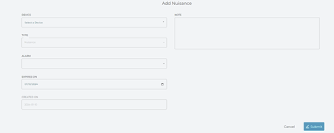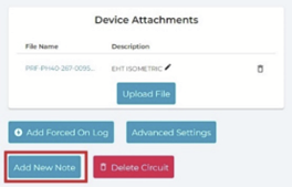 The device page offers another avenue for adding nuisance alarms. Positioned below device attachments and circuit information, the add new note section ensures context-specific entry with respect to the device in question.